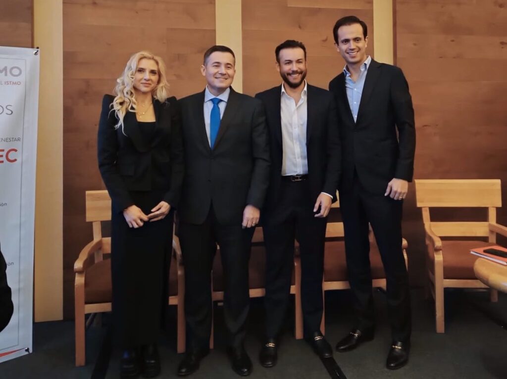 Armando González, vicepresidente de Operaciones; Fernando Galván miembro del Consejo de Administración, de ProIstmo; Elena Achar, directora de Comunicación y Asuntos Públicos; y Javier Aguilera, presidente del Consejo de Administración de Proistmo, explicaron que el Corredor Interoceánico persigue implementar una política industrial innovadora que impulse vocaciones como las ingenierías y sectores estratégicos de la región.
